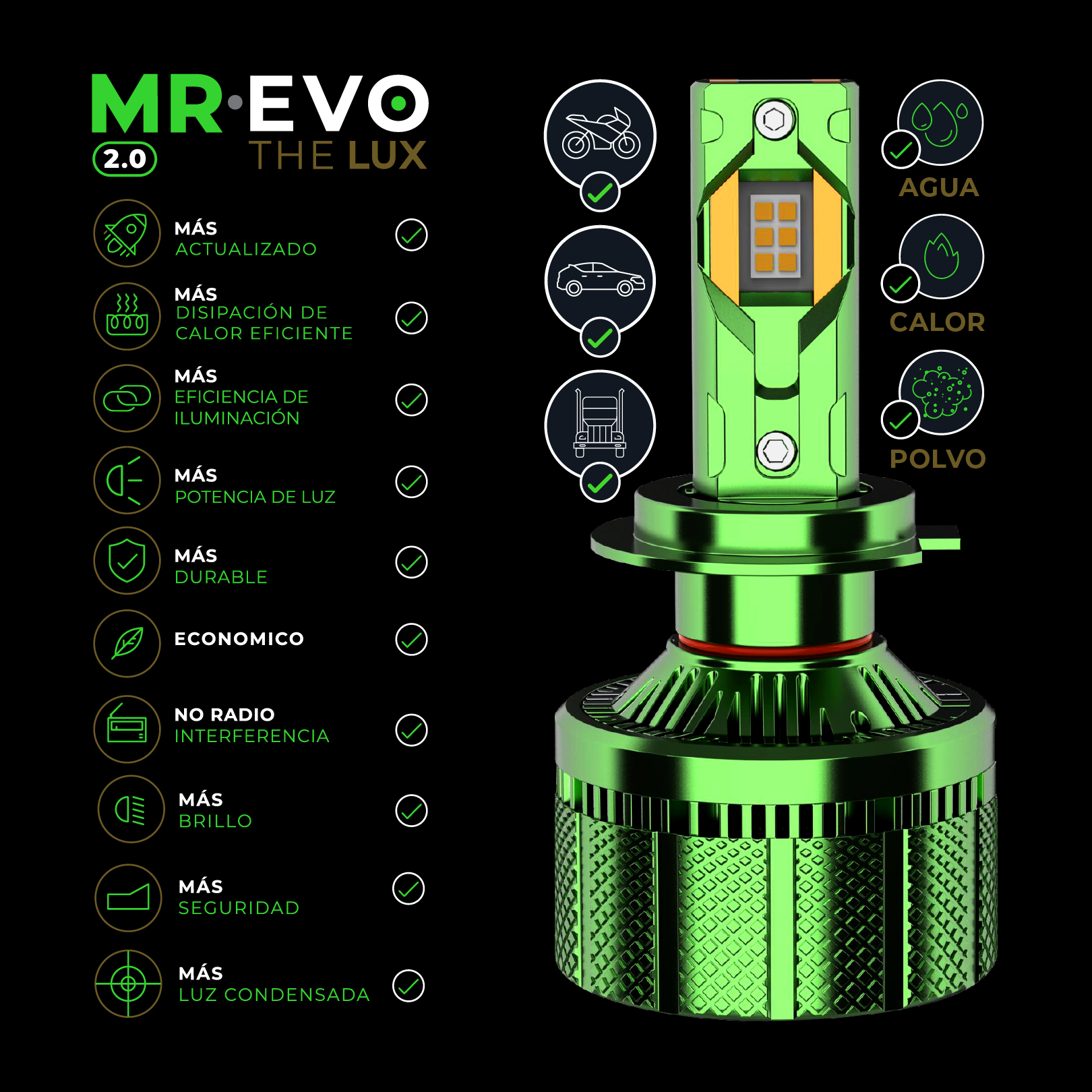 | Mr EVO The LUX (Referencia) | H4, H1, H3, H7, H11, 9005, 9006 |